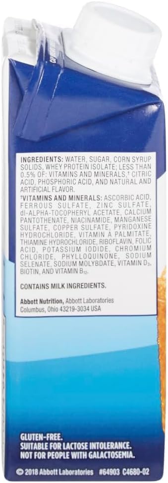 Agua, azúcar, sólidos de jarabe de maíz, aislado de proteína de suero. Menos del 0,5 % de: vitaminas y minerales (ácido ascórbico, sulfato ferroso, sulfato de zinc, acetato de dl-alfa-tocoferilo, pantotenato de calcio, niacinamida, sulfato de manganeso, sulfato de cobre, clorhidrato de piridoxina, palmitato de vitamina A, clorhidrato de tiamina, riboflavina, ácido fólico, yoduro de potasio, cloruro de cromo, filoquinona, selenato de sodio, molibdato de sodio, vitamina D3, biotina, vitamina B12), ácido cítrico, ácido fosfórico y sabores naturales y artificiales.
