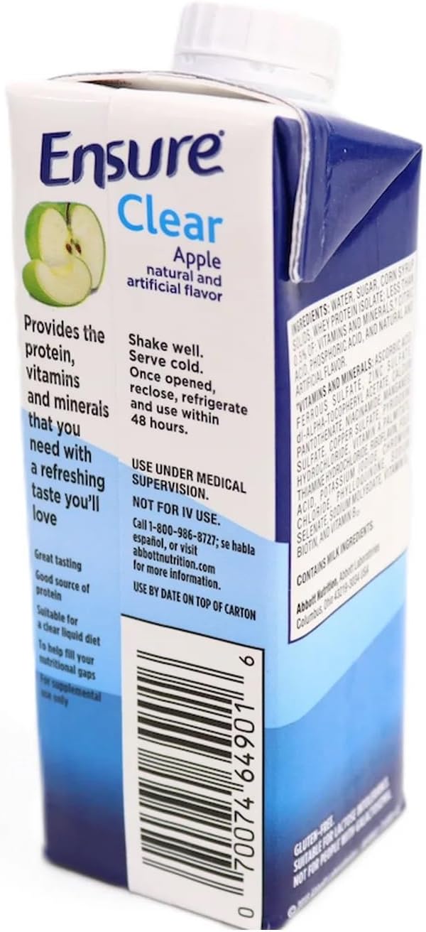 ENSURE CLEAR THERAPEUTIC NUTRITION es una bebida nutritiva líquida transparente de delicioso sabor que contiene proteínas de alta calidad y nutrientes esenciales. No contiene grasa, lo que la convierte en la opción ideal para pacientes con dietas de líquidos claros, pre y posquirúrgicas, de preparación intestinal, con malabsorción de grasas y con restricción de grasas. También es ideal para quienes prefieren una alternativa con sabor a fruta a los suplementos cremosos tipo batido. Ensure Clear Therapeutic Nutrition puede beneficiar a pacientes con desnutrición, riesgo nutricional o pérdida de peso involuntaria. Vía oral. Úselo bajo supervisión médica.