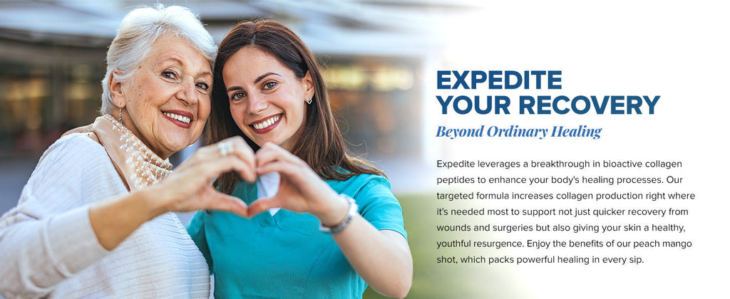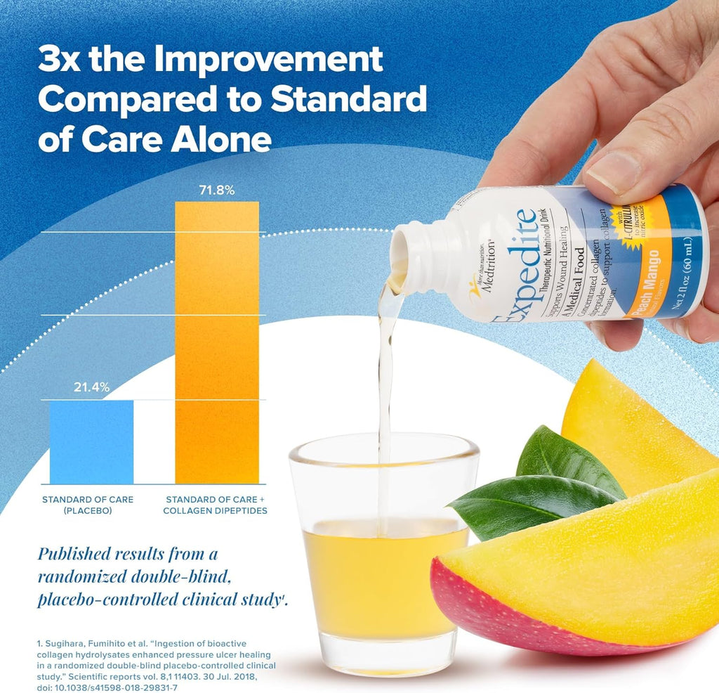 Expedite es un producto de nutrición oral concentrado específico para heridas, formulado para favorecer la cicatrización. Presentado en una práctica dosis diaria de 56 ml (2 onzas líquidas), Expedite optimiza el cuidado de las heridas al reducir la carga del personal y mejorar los resultados del paciente mediante la síntesis de colágeno dirigida y el soporte de la herida.