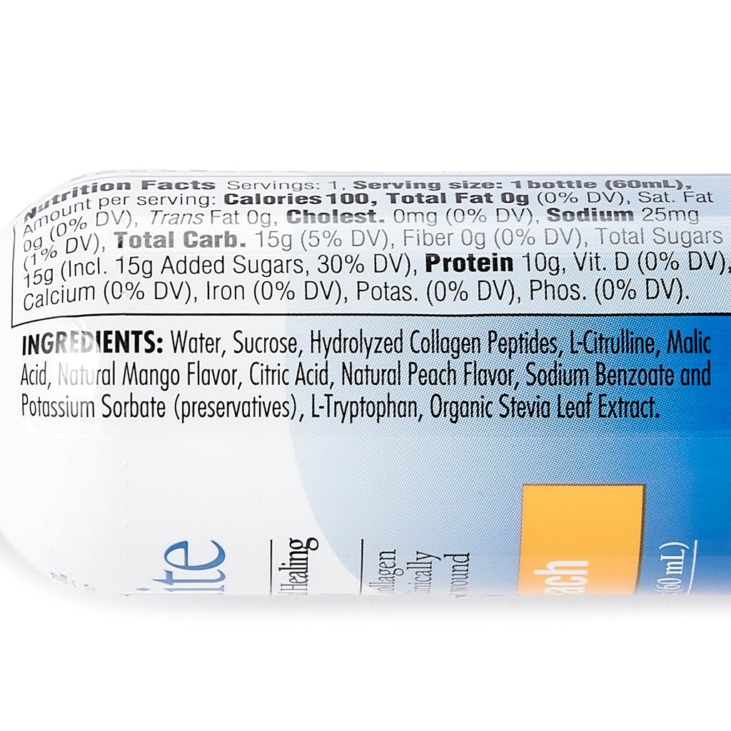 Melocotón Mango: Agua, sacarosa, péptidos de colágeno hidrolizados, L-citrulina, ácido málico, sabores naturales, ácido cítrico, benzoato de sodio y sorbato de potasio (conservantes), L-triptófano, extracto de hoja de stevia orgánica.