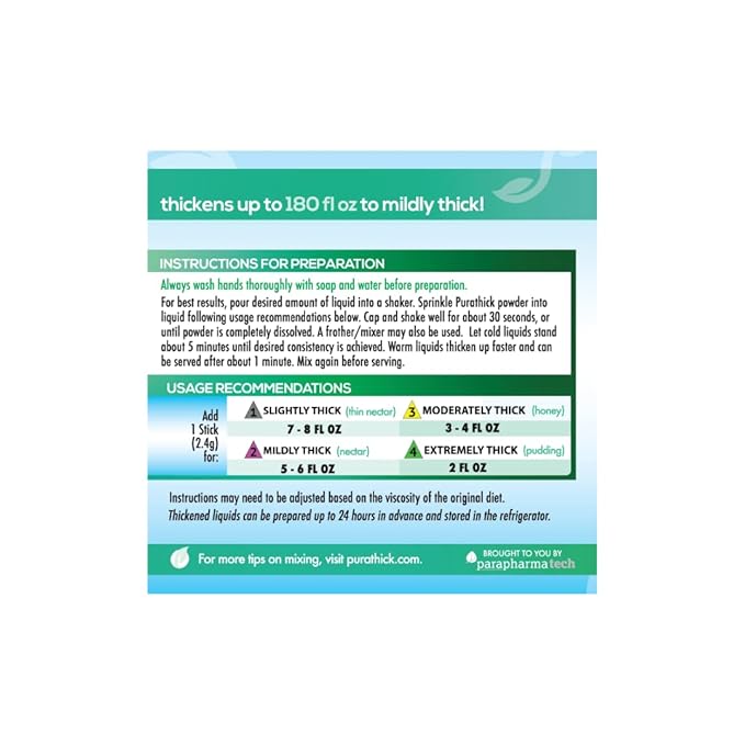 • Purathick espesa las bebidas para que queden ligeramente espesas (a veces también se las llama consistencia de "néctar fino"), lo que las hace más fáciles de ingerir para quienes tienen dificultades para tragar.