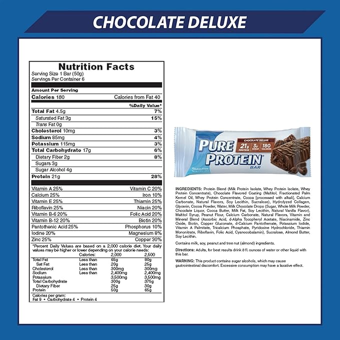 La barra de proteína pura de chocolate de lujo te ofrece un aporte rápido de proteínas en cualquier momento del día. Esta barra de 180 calorías se adapta fácilmente a tu plan de alimentación diario y aporta 21 g de proteína y 2 g de fibra en un práctico envase portátil. Además, esta barra de 50 g incluye una gran cantidad de nutrientes esenciales, incluyendo el 25 % de tus necesidades diarias de calcio, vitamina A, riboflavina y zinc.