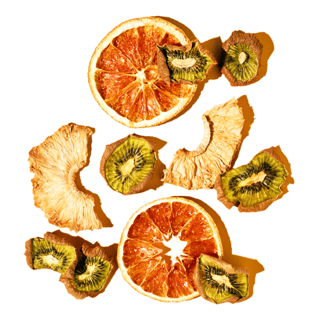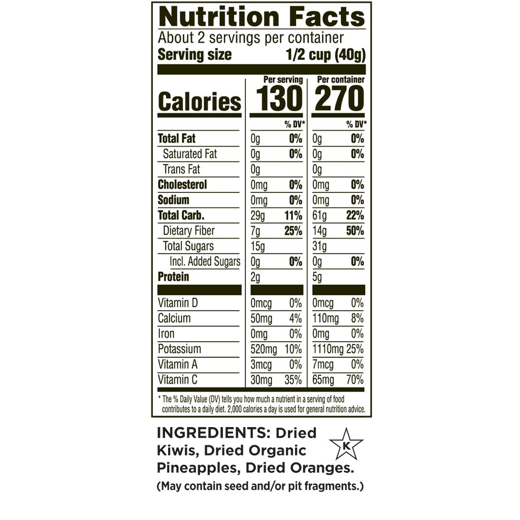 Ingredientes: kiwis deshidratados, piñas orgánicas deshidratadas, naranjas deshidratadas.