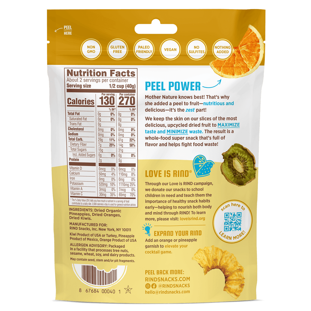 Naranja agridulce. Piña orgánica. Kiwi ácido. 110 calorías por porción. 6 g de fibra por porción. 0 g de azúcares añadidos por porción. Sin gluten. Vegano. Alto en vitamina C. Apto para dieta paleo. Proyecto sin OMG verificado. Nongmoproject.org. Sé auténtico. Cómete la cáscara. Sin sulfitos. Sin aditivos. Secado suave. El poder de la cáscara. ¡La madre naturaleza lo sabe todo! Por eso le añadió cáscara a la fruta: la cáscara contiene más vitaminas, antioxidantes y fibra que cualquier otra parte. Conservamos la cáscara en nuestras rebanadas de las frutas deshidratadas más deliciosas para maximizar el sabor y minimizar el desperdicio. El resultado es un súper refrigerio integral que es bueno para ti y para el planeta. El amor es cáscara: a través de nuestra campaña "El amor es cáscara", donamos refrigerios nutritivos a niños en edad escolar necesitados y les enseñamos la importancia de los hábitos saludables de refrigerio desde pequeños, ¡ayudándoles a nutrir cuerpo y mente a través de la cáscara! Para obtener más información, visita: loveisrind.org. Amplía tu menú añadiendo una guarnición de naranja o piña para realzar tus cócteles. Rindsnacks.com. Loveisrind.org. Instagram. Facebook. (at)rindsnacks. Más información: rindsnacks.com.
