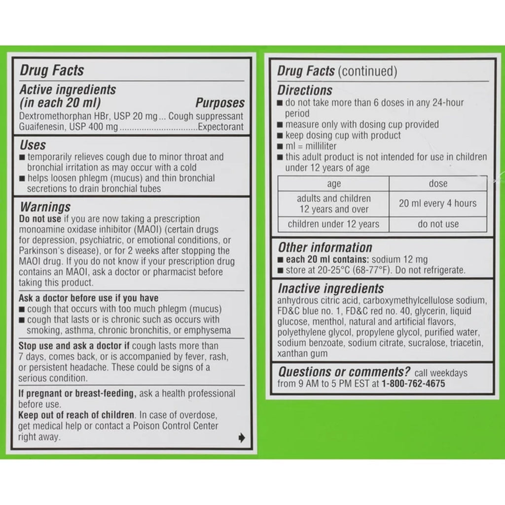 • La botella contiene 8 onzas de medicamento para la tos con sabor a frambuesa que no produce somnolencia.