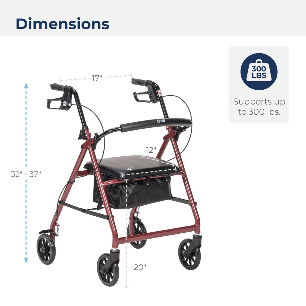 Question: What is the weight capacity of Drive Medical Aluminium Rollator For Seniors and Elders, Wheel size 6inches With Height Adjustable 13 x 12inch, Red Color , Foldable, 11038A?