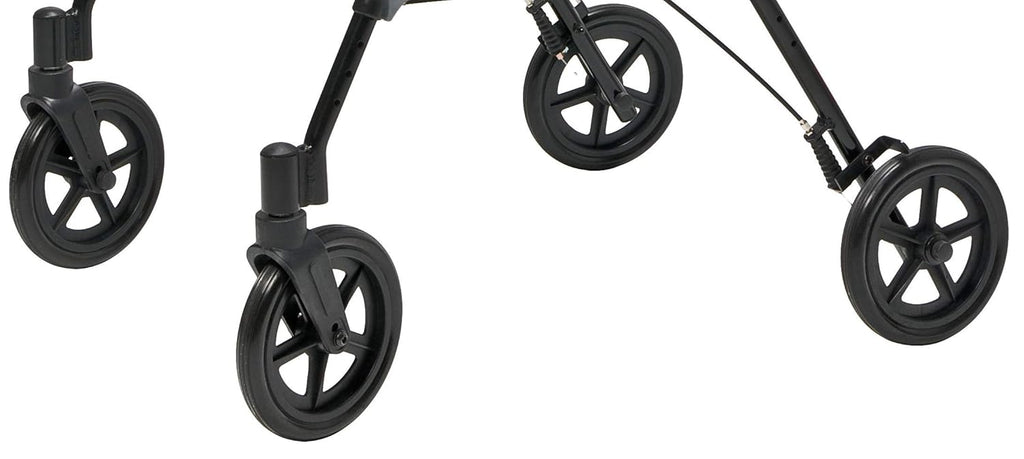 Question: How large are the wheels on Lumex Rollator For Seniors and Elders, Wheel size 8 inch With Height Adjustable 9.5" to 22.5", Weight Capacity 350lbs Burgundy Color ,Foldable, RJ4718R and what terrain is it suited for?