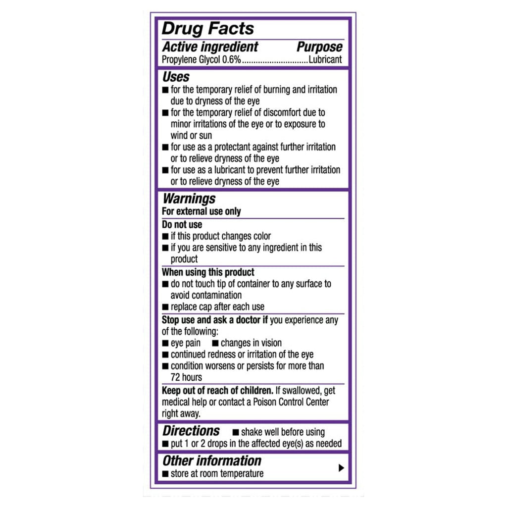 • Use lubricante de propilenglicol al 0,6 % para el alivio temporal del ardor y la irritación causados ​​por la sequedad del ojo; úselo para el alivio temporal de las molestias debido a irritaciones menores del ojo, como las causadas por la exposición al viento o al sol; úselo como protector contra irritaciones adicionales.