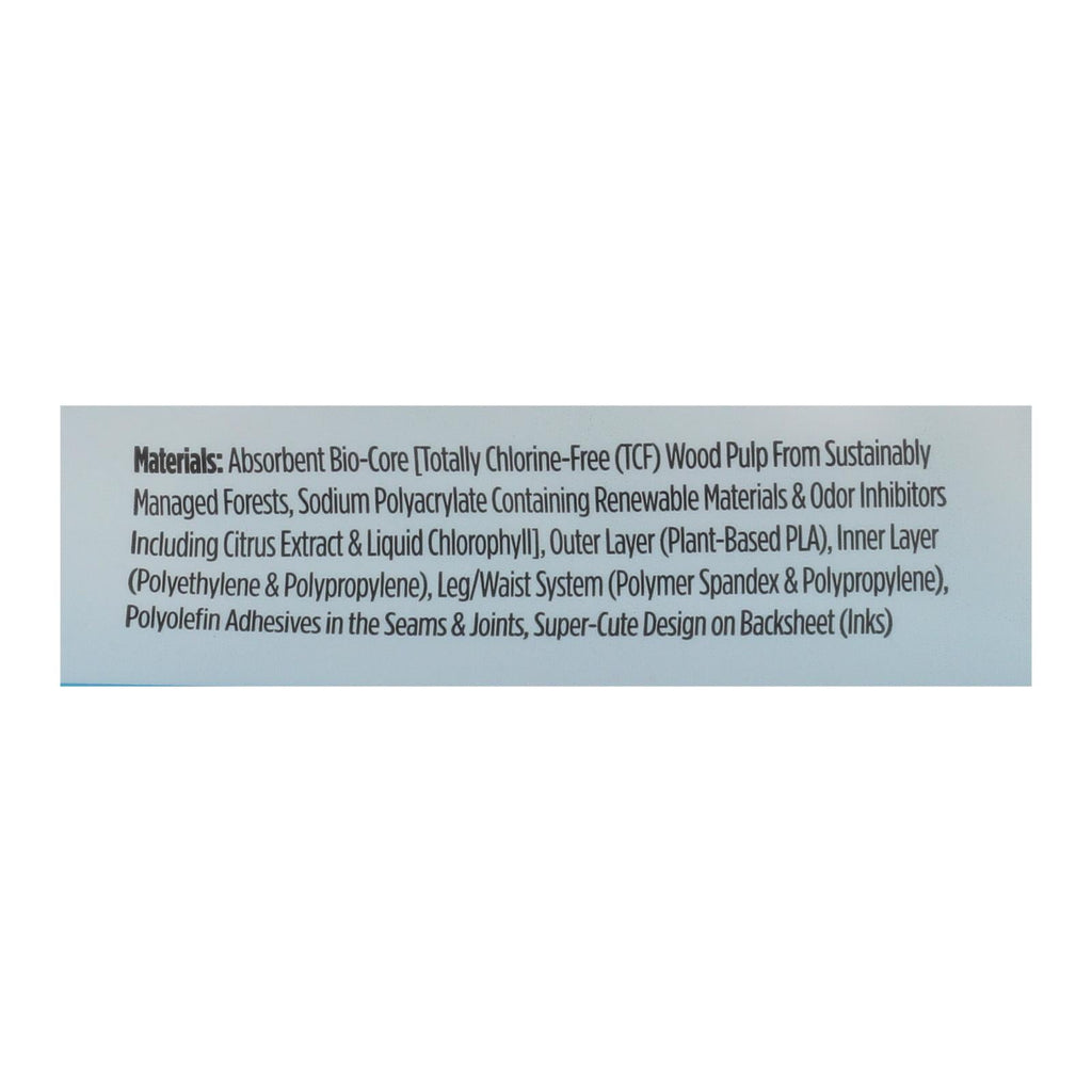 Ingredientes: Bio-núcleo absorbente [totalmente libre de cloro; TCF; pulpa de madera de bosques gestionados de forma sostenible; poliacrilato de sodio con materiales renovables e inhibidores de olores, incluyendo extracto de cítricos y clorofila líquida]; capa exterior; tela lisa de origen vegetal; capa interior; polietileno y polipropileno; sistema de piernas/cintura; spandex de polímero y polipropileno; adhesivos de poliolefina en las costuras y juntas; diseño superbonito en la lámina posterior; tintas