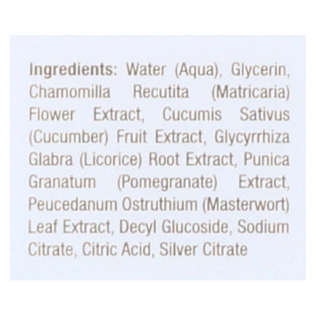 Ingredientes: agua, aqua, glicerina, extracto de flor de Chamomilla recutita, matricaria, extracto de flor de Cucumis sativus, pepino, extracto de fruto de Glycyrrhiza glabra, regaliz, extracto de raíz de Punica granatum, extracto de granada, extracto de Peucedanum ostruthium, agripalma, extracto de hoja de Decil glucósido, citrato de sodio, ácido cítrico, citrato de plata.