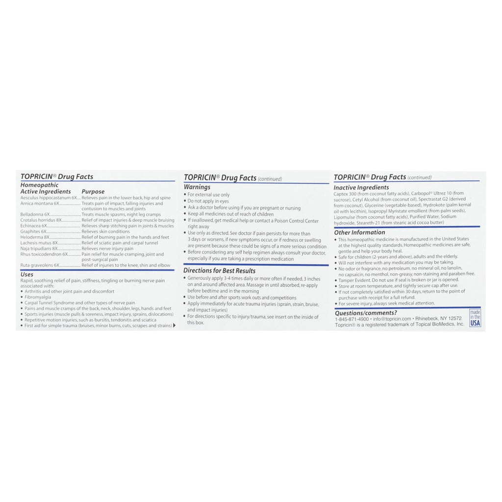 La crema analgésica Topricin es una crema homeopática no grasa que no contiene olor ni fragancia, petróleo, aceite mineral, lanolina, capsaicina, mentol ni parabenos. Nuestra crema viene en un frasco de 113 g (4 oz) y está formulada para aliviar el dolor muscular, articular y nervioso, incluyendo tendinitis, hematomas, esguinces, torceduras y calambres. Consulte la etiqueta para conocer las advertencias y riesgos.