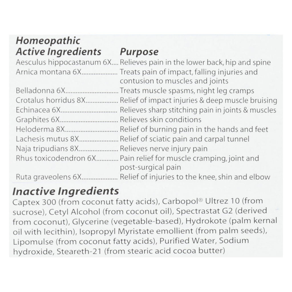 Ingredientes: aesculus hippocastanum (6 veces para aliviar el dolor en la espalda baja, cadera y columna vertebral); árnica montana (3 veces para ayudar a tratar el dolor por impacto, lesiones por caídas y contusiones en músculos y articulaciones); belladonna (6 veces para ayudar a tratar los espasmos musculares, calambres nocturnos en las piernas); crotalus horridus (12 veces para aliviar las lesiones por impacto y los hematomas musculares profundos); equinácea (3 veces para aliviar el dolor punzante agudo en articulaciones y músculos); graphites (3 veces para aliviar las afecciones de la piel); heloderma (12 veces para aliviar las quemaduras).