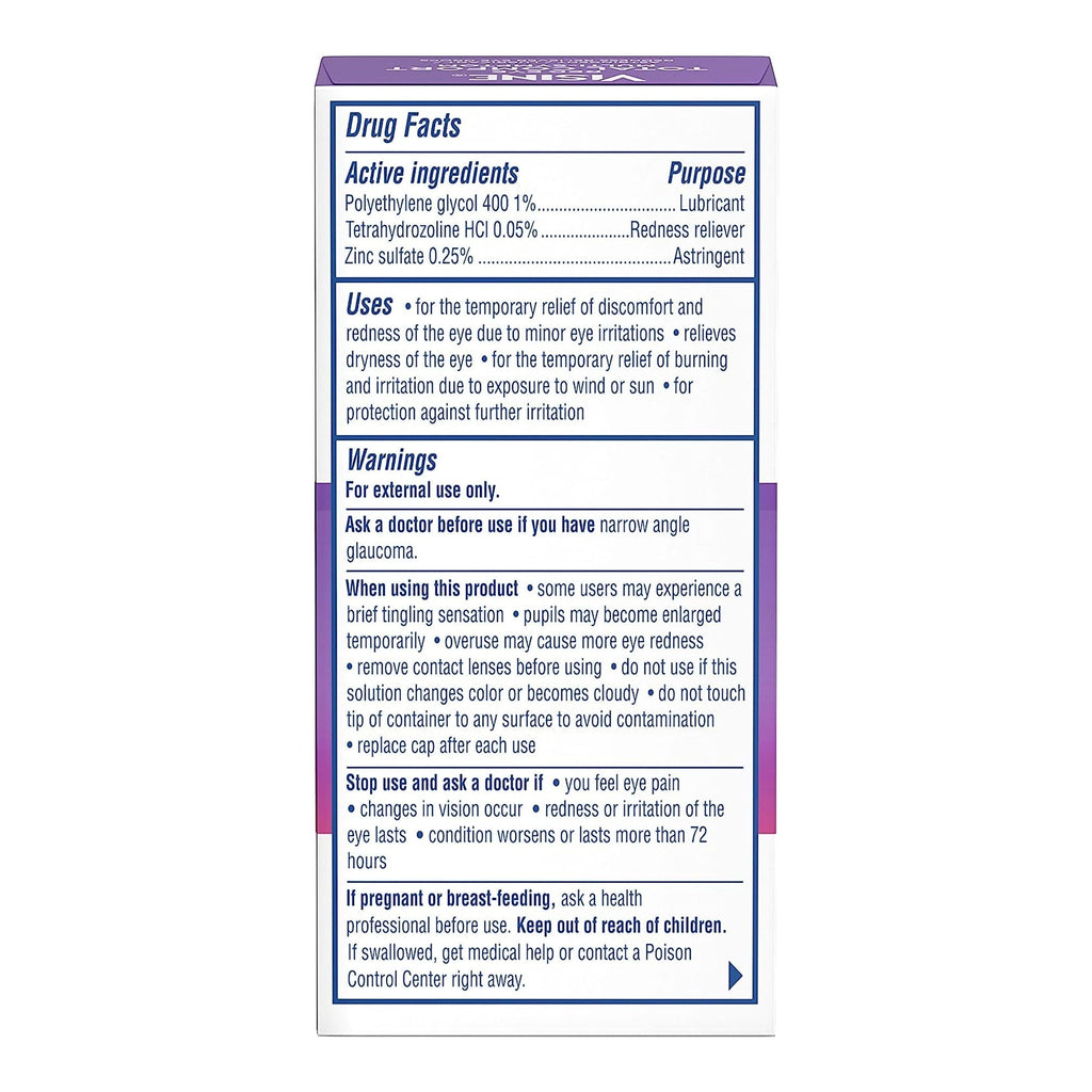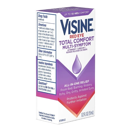 • Utilice las gotas oftálmicas Visine Red Eye Total Comfort Multi-Symptom para el alivio temporal de las molestias y el enrojecimiento del ojo debido a irritaciones oculares menores.