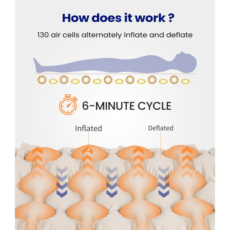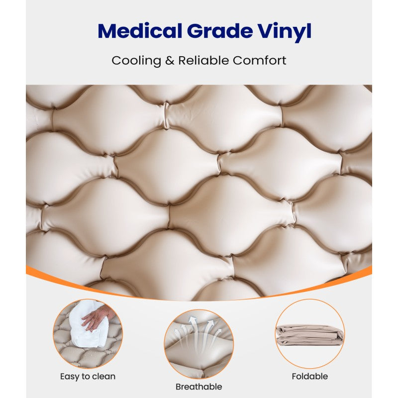 Cuenta con 130 celdas de aire esféricas que se inflan y desinflan alternativamente para una comodidad óptima. Reduce activamente el estrés, promoviendo una circulación sanguínea saludable. Ideal para personas que requieren reposo prolongado en cama, como embarazadas, personas con fracturas o movilidad reducida. Ligera y fácil de usar, esta almohadilla de presión VOCIC es ideal para diversas camas de enfermería. El ruido se mantiene por debajo de los 45 dB, garantizando un sueño reparador. Fabricada con PVC médico, es impermeable, resistente a las manchas y saludable.