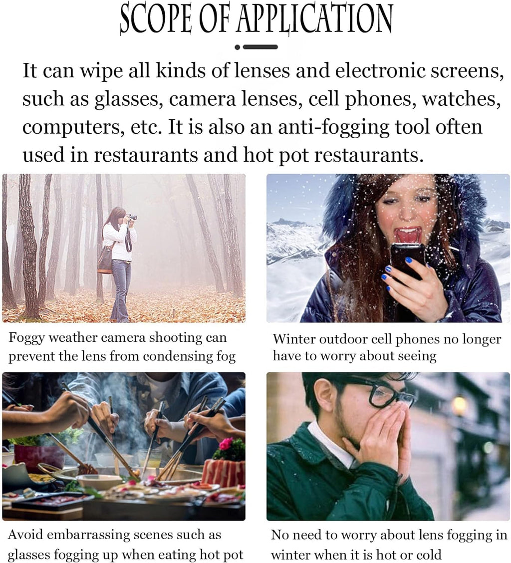 Have you also encountered this situation? When wearing a mask, drinking hot drinks, driving in the rain, or taking a shower, your glasses or car glass are fogged up and affect your vision, which brings a lot of inconvenience to your life. Use the lens anti-fog wipes, a piece can easily solve the lens fogging problem . Use method: Tear open the package, take out the wet dots and unfold, first wipe the entire lens cover with wet wipes once, line into a foam cover, then fold the paper towel in one direction and gently wipe, paper towel to retrieve excess liquid, 5-10 seconds after the anti-fog liquid on the lens to be thoroughly dry can be used. Note: You can not use other wipes to wipe the surface of the lens that has been coated with anti-fog coating, and avoid rinsing with water, otherwise it will cause the lens to have anti-fog coating failure or reduce the anti-fog effect. Product composition: Nano anti-fogging agent, ethanol, biguanide disinfectant, surfactant Working Principle. This product adopts nano anti-fog coating, using the lotus effect to destroy the adhesion between water molecules and glass, preventing the lens surface from fogging while maintaining the cleanliness and clarity of the lens. Detailed product parameters: Product name: Anti Fog Lens Wipes Product specification: 100 pieces/box Product size: 60mm * 120mm Product function: anti-fog, dust removal, cleaning, oil removal, quick dry Scope of application: all kinds of glasses, camera lenses, cell phone screens, computers, watches, diving goggles, bathroom mirrors and car mirrors.