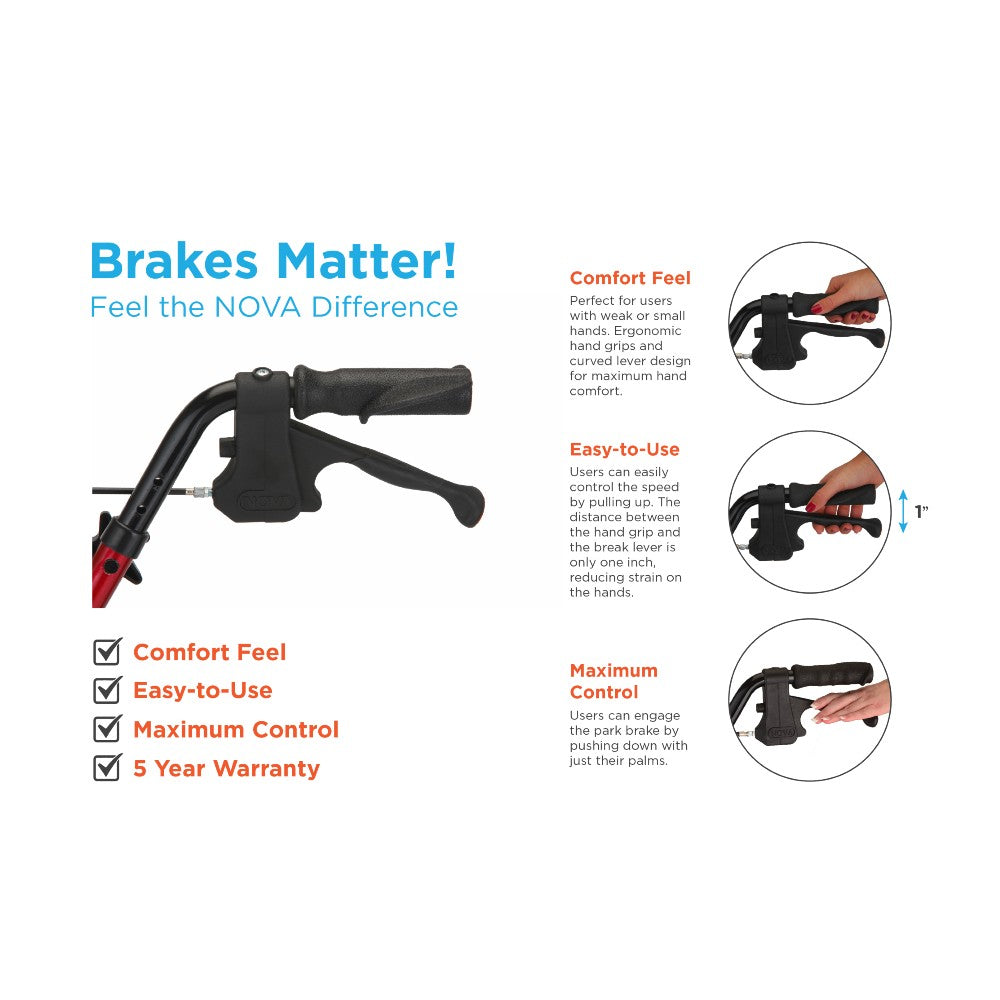 • WHEELS & BRAKES: Equipped with All-Terrain 8" rubber wheels with a 1 3/4" wide base, NOVA's wheels are durable, great for indoor and outdoor use and make the ride smooth and stable. NOVA's patented feather touch hand brakes are uniquely designed for maximum comfort and control. It is easy to engage the brake with a small grip and minimal hand strength. Parking or locking the brakes takes just a gentle push downward on the lever and a pull upwards to release. Our brakes are backed by the best Brake Warranty with a 5 year warranty on all brake parts