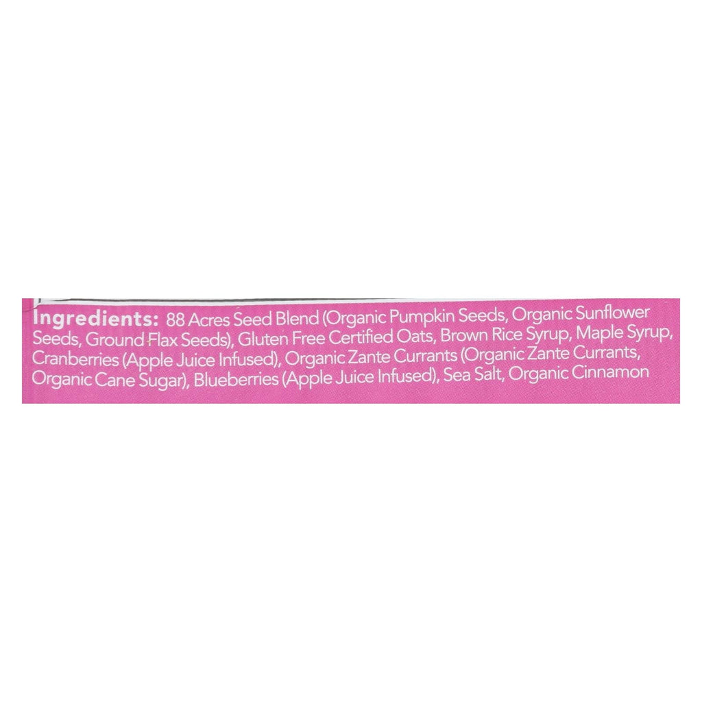 ingredients : 88 acres seed blend;organic pumpkin seeds;organic sunflower seeds;ground flax seeds;gluten free certified oats;brown rice syrup;maple syrup;cranberries;apple juice infused;organic zante currants;organic cane sugar;blueberries;sea salt;organic cinnamon