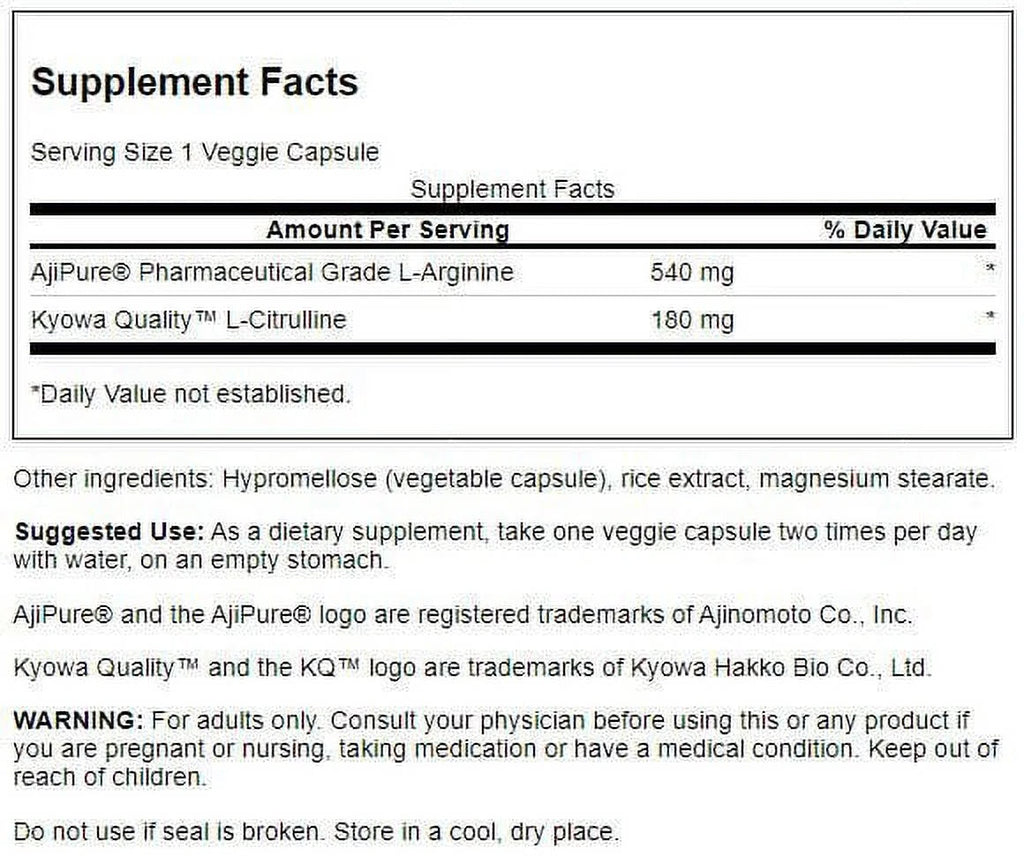 AjiPure Pharmaceutical Grade 540 mg *,Kyowa Quality L-Citrulline 180 mg *,Other ingredients: Hypromellose (vegetable capsule), rice extract, rice concentrate.,As a dietary supplement, take one veggie capsule two times per day with water, on an empty stomach.,AjiPure and the AjiPure logo are registered trademarks of Ajinomoto Co., Inc. Kyowa Quality and the KQ��� logo are trademarks of Kyowa Hakko Bio Co., Ltd./div>