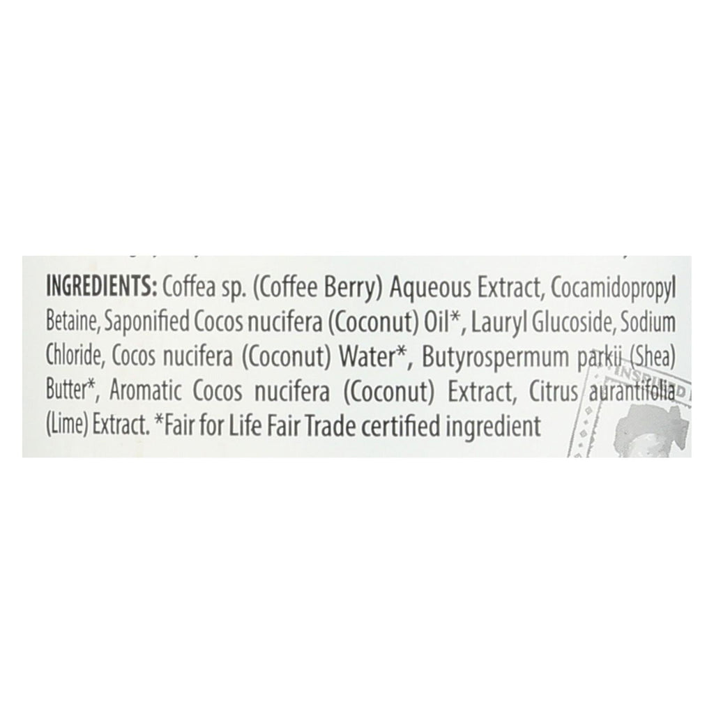 ingredients : coffea arabica;coffee;berry aqueous extract;saponified cocos nucifera;coconut;oil;lauryl glucoside;coco-betaine;sodium chloride;cocos nucifera;water;butyrospermum parkii;shea;butter;citrus aurantifolia;lime;extract