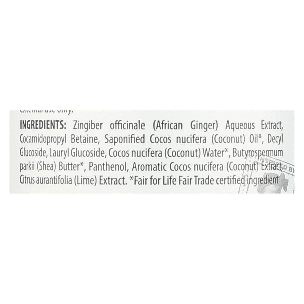 ingredients : zingiber officinale;ginger;aqueous extract;saponified cocos nucifera;coconut;oil;decyl glucoside;coco-betaine;lauryl glucoside;cocos nucifera;water;butyrospermum parkii;shea;butter;citrus aurantifolia;lime;extract;panthenol