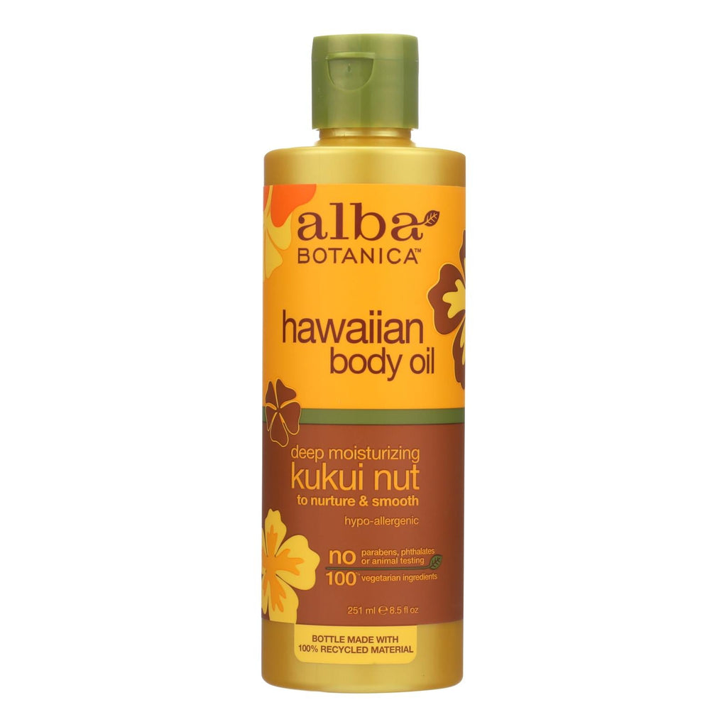 Alba botanica deep moisturizing kukui nut hawaiian body oil is nutrient-rich, super-smoothing and fast-absorbing. Kukui nut, high in essential fatty acids, nourishes, hydrates and protects from moisture loss. Sweet almond, coconut, flaxseed and sunflower oils douse skin in silky perfection. This product contains no artificial colors, parabens, phthalates or harsh sulfates. Our hypo-allergenic body oil is made of 100% vegetarian ingredients and is not tested on animals. Includes one 8.5 fl. Oz. Bottle of alba botanica deep moisturizing kukui nut hawaiian body oil.