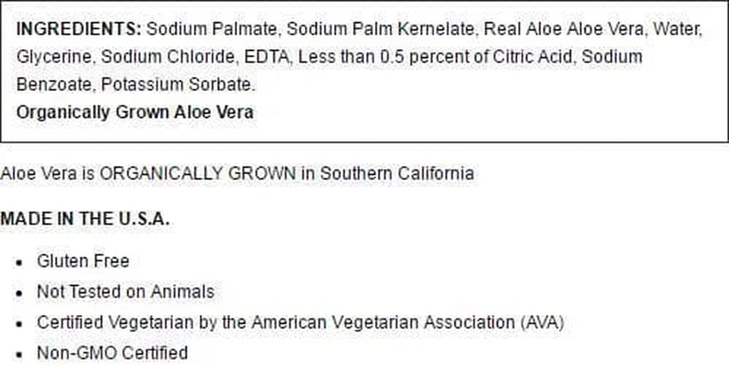 INGREDIENTS:,Sodium Palmate, Sodium Palm Kernelate, Real Aloe Aloe Vera, Water, Glycerine, Sodium Chloride, EDTA, Less than 0.5 percent of Citric Acid, Sodium Benzoate, Potassium Sorbate.,Aloe Vera is ORGANICALLY GROWN in Southern California/div>
