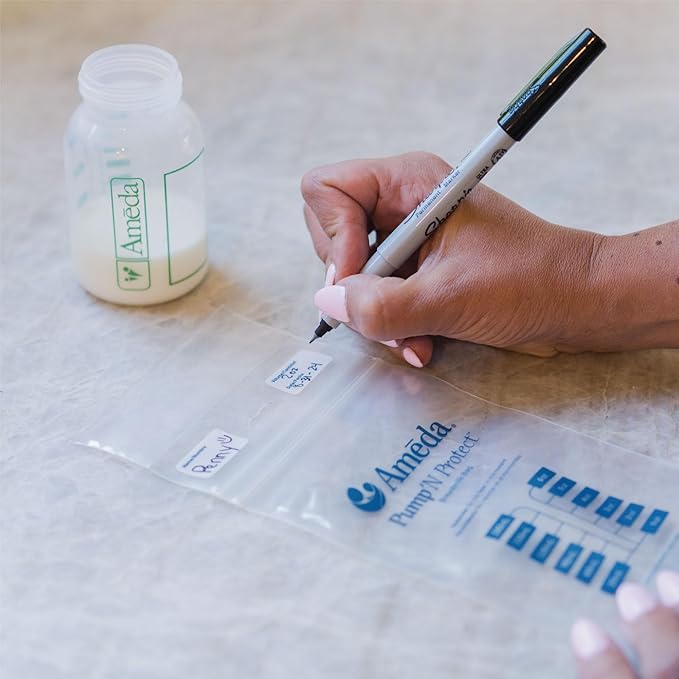 Ameda Pump'N Protect Breastmilk Storage Bags offer a practical solution for storing precious breastmilk. These pre-sterilised storage bags come in a convenient pack of 50 and feature clear measurement markings for precise tracking of milk volume. The bags are designed with a double-zip seal to prevent leakage and maintain freshness. Their flat profile allows for efficient storage in the refrigerator or freezer, while the write-on tab helps you note important details like date and time. The bags are made from durable, food-grade material and can stand upright or lay flat. Each bag has a generous capacity to accommodate various pumping sessions. The bags' design allows for direct pumping when used with compatible adapters (sold separately), reducing transfer waste and making the storage process more streamlined. These storage bags are ideal for working mothers or anyone needing to store breastmilk for later use.