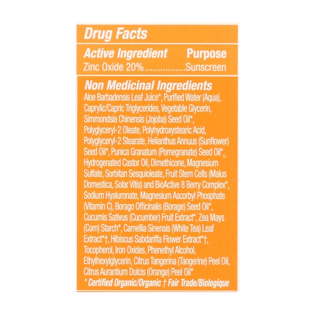 ingredients : active ingredient zinc oxide 20% purpose sunscreen non medicinal aloe barbadensis leaf juice;purified water;aqua;caprylic/capric triglycerides;vegetable glycerin;simmondsia chinensis;jojoba;seed oil;polyglycerl-2 oleate;polyhydroxystearic acid;polyglyceryl-2 stearate;helianthus annuus;sunflower;punica granatum;pomegranate seed oil;hydrogenated castor oil;dimethicone;magnesium sulfate;sorbitan sesquioleate;fruit stem cells;malus domestica;solar vitis;and bioactive 8 berry complex;sodium hyaluron