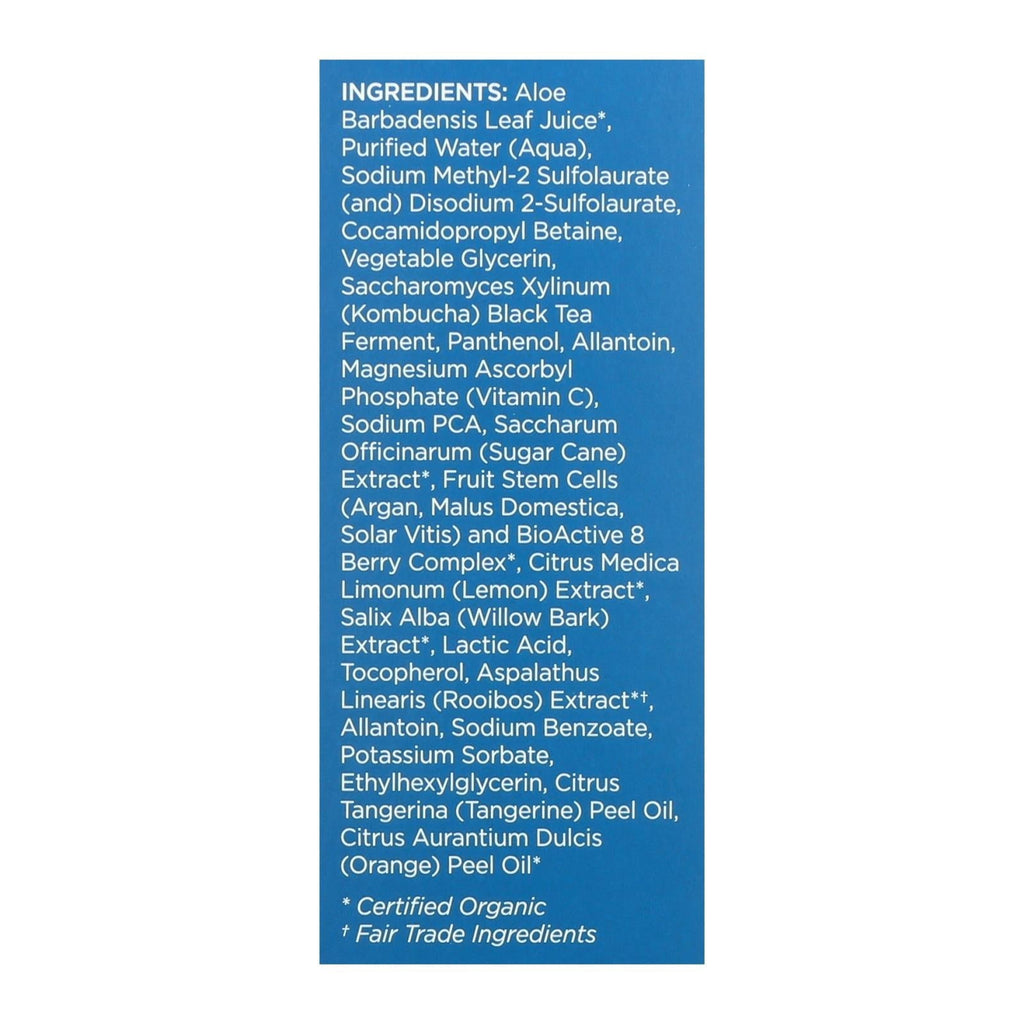 ingredients : aloe barbadensis leaf juice;purified water;aqua;sodium methyl-2 sulfolaurate;and;disodium 2-sulfolaurate;cocamidopropyl betaine;vegetable glycerin;saccharomyces xylinum;kombucha;black tea ferment;panthenol;allantoin;magnesium ascorbyl phosphate;vitamin c;sodium pca;saccharum officinarum;sugar cane;extract;fruit stem cells;argan;malus domestica;solar vitis;and bioactive 8 berry complex;citrus medica limonum;lemon;salix alba;willow bark;lactic acid;tocopherol;aspalathus linearis;rooibos;extract*†;