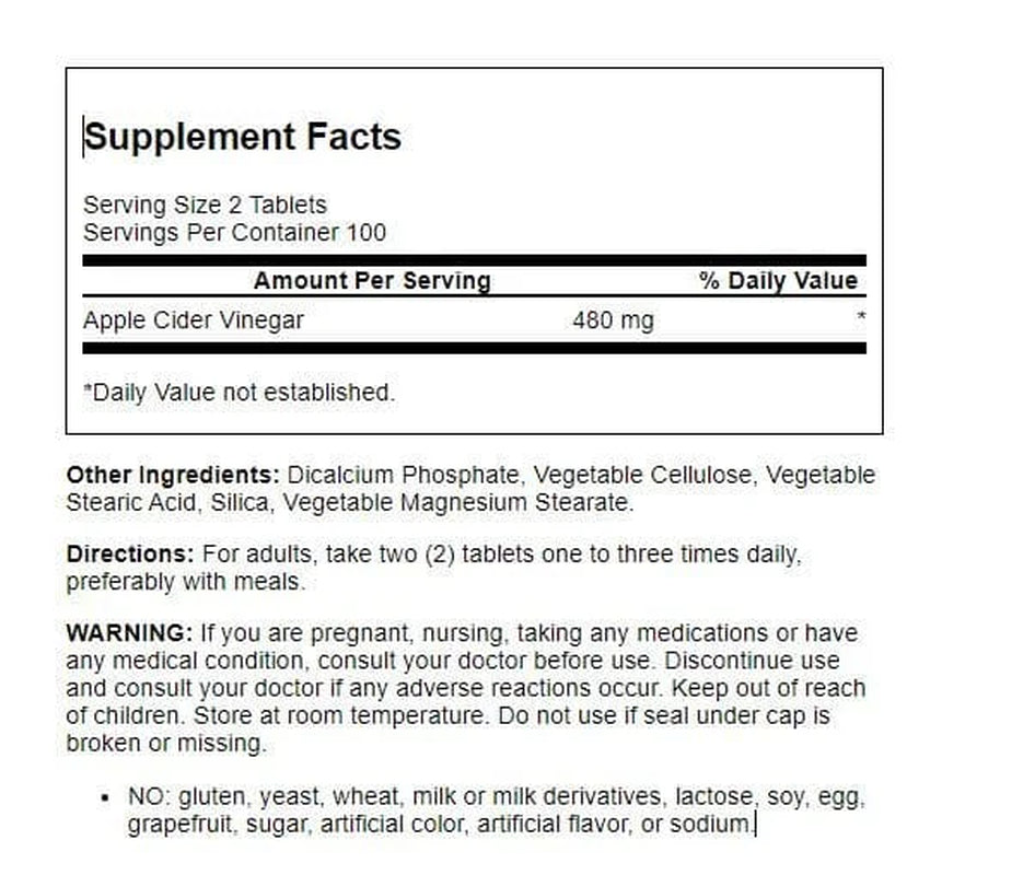 American Health Apple Cider Vinegar tablets deliver all the nutritional benefits of apple cider vinegar, and are provided in tablet form for those who don't enjoy the tart taste of vinegar. Highly popular with fitness enthusiasts and individuals following healthy diets, apple cider vinegar has been traditionally used to purify and cleanse the body and makes a perfect addition to your nutritional wellness program. This product contains no gluten, yeast, wheat, milk or milk derivatives, lactose, soy, egg, grapefruit, sugar, preservatives, artificial color, artificial flavor or sodium.