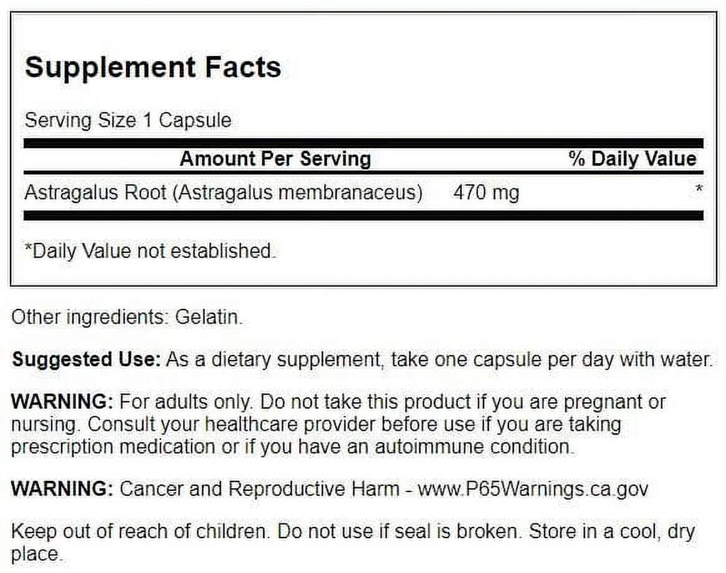 Answer: Astragalus Root 470 Mg 100 Capsules is a fiber/digestive health supplement described in the product details.