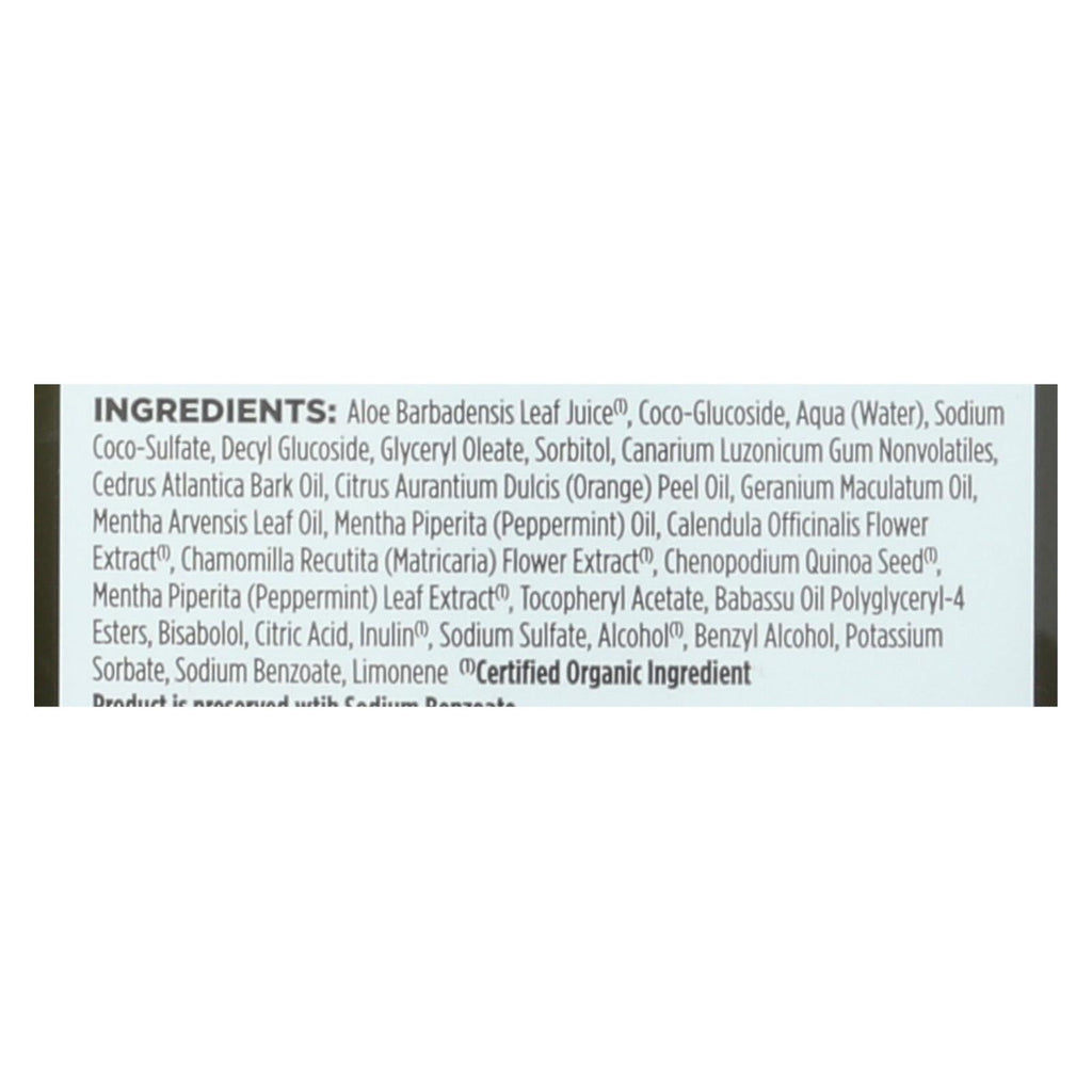 ingredients : aloe barbadensis leaf juice¹;coco-glucoside;aqua;water;sodium coco-sulfate;decyl glucoside;glyceryl oleate;sorbitol;canarium luzonicum gum nonvolatiles;cedrus atlantica bark oil;citrus aurantium dulcis;orange;peel oil;geranium maculatum oil;mentha arvensis leaf oil;mentha piperita;peppermint;oil;calendula officinalis flower extract¹;chamomilla recutita;matricaria;flower extract¹;chenopodium quinoa seed¹;leaf extract¹;tocopheryl acetate;babassu oil polyglyceryl-4 esters;bisabolol;citric acid;inul