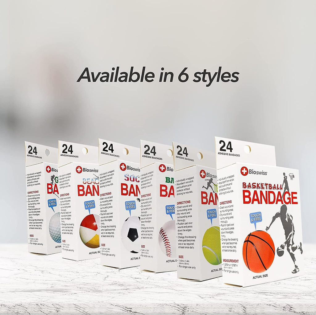 Want to score a hole in one? These fun golf ball sports novelty bandages are a great way to put big smiles on the faces of both little boys, girls, and even adults while treating their boo boos. These skin bandages aid in the treatment of a variety of different wounds, whether it be for a minor cut, burn, scrape, shot injection, blister, and much more. These small size flex bandages feature absorbent, non stick cushion pads which aids in protecting the injury without sticking to the spot of the wound, wrapping comfortably on your arm, leg, face, knee, or even to wrap around your finger tip, and much more. This self adhering bandage pack contains 24 golf balls bandage strips, and are individually wrapped for safe handling, making these childrens bandages great for travel, home first aid kits, school nurses, and pediatric medical practitioners. Our cute and funny junior bandages are composed of sterile, latex free, breathable, and flexible material for reliable long-lasting quality. These boy and girl sport shaped bandages are perfect for schools and playgrounds, and also make for cute stocking stuffers, fun Easter basket present, or even as a funny white elephant gift. Our bandaging supplies are an excellent way to put your child, toddler, or baby at ease, even with a booboo. BioSwiss athletic sport shaped bandages are offered in golf ball, soccer ball, basketball, baseball, football, and tennis ball styles.