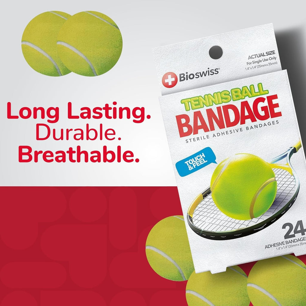• TENNIS BALL BANDAGES: This 24 piece pack of stylish tennis ball bandages is great for putting a smile on kids' faces while protecting wounds such as cuts, scrapes, and burns; sticky bandages are perfect for kids and adults alike, and also for school nurses and pediatric doctors