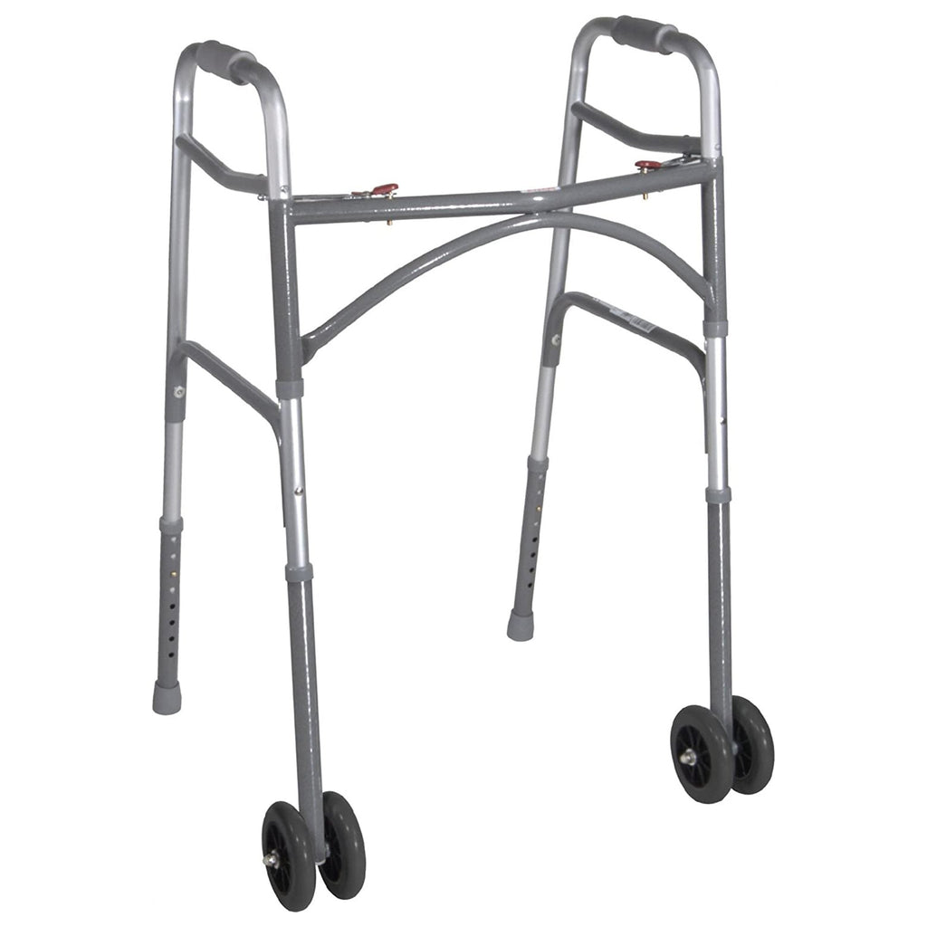 This walker easily adjusts between 32 1/2 and 39 inches to accommodate users of different heights, making it a great choice for care facilities where patients share accessibility equipment. Push-button, dual-release mechanisms allow users to easily fold the walker using their fingers, palms, or side of hand to accommodate different abilities. The vinyl-contoured hand grips are set 17 inches apart for ideal comfort and stability.