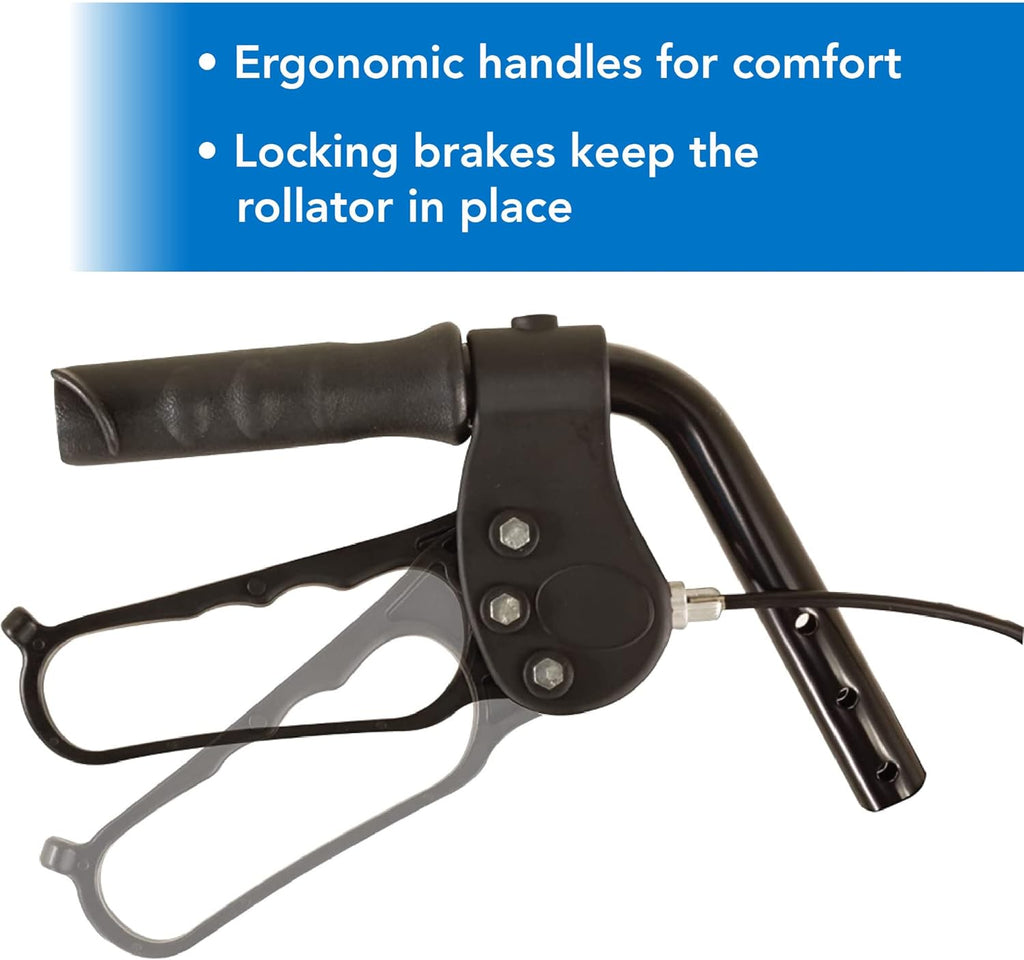 Answer: Most rollators use loop hand brakes that engage the wheels when squeezed and lock when pushed down. Test before each use, keep cables free of kinks, and contact service if braking feels weak or uneven.