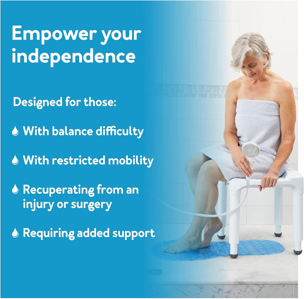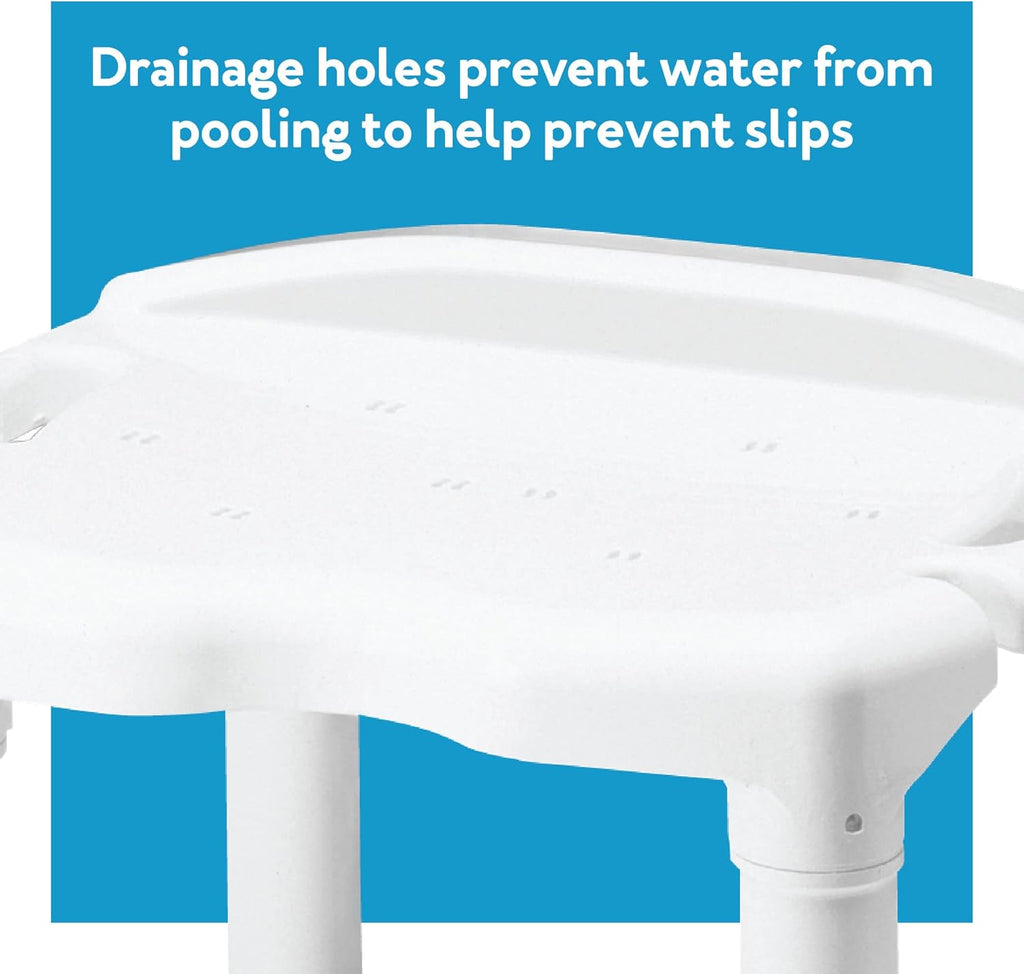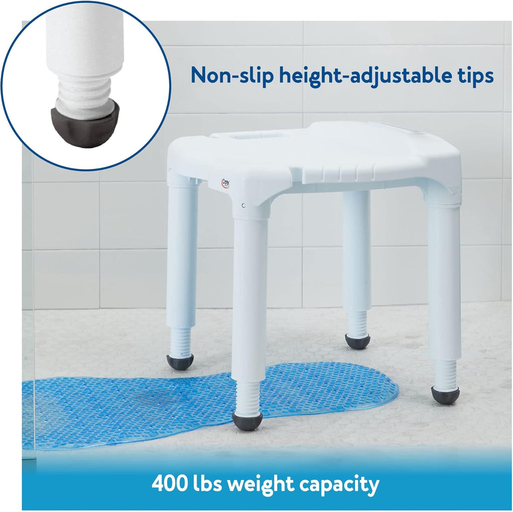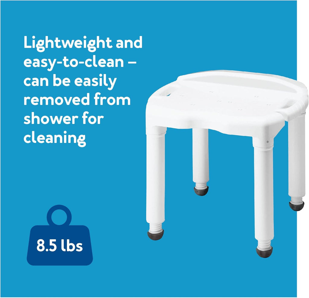 The Universal Bath Seat without Back fits into virtually every tub or shower, whether at home or away. It features an innovative design to support up to 400 lbs comfortably. The patented Exact Level height adjustment makes height adjustment easy. There are drainage holes in the shower chair to eliminate water pooling and a convenient notch for a hand-held shower spray. This bath chair is easy to assemble without the need for tools.