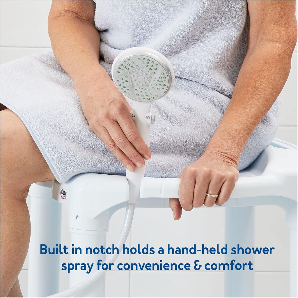 • Created for comfort. The shower chair's innovative design provides an uplevel of comfort and shower safety. The wide 18" seat provides a comfortable level of seating for movement.