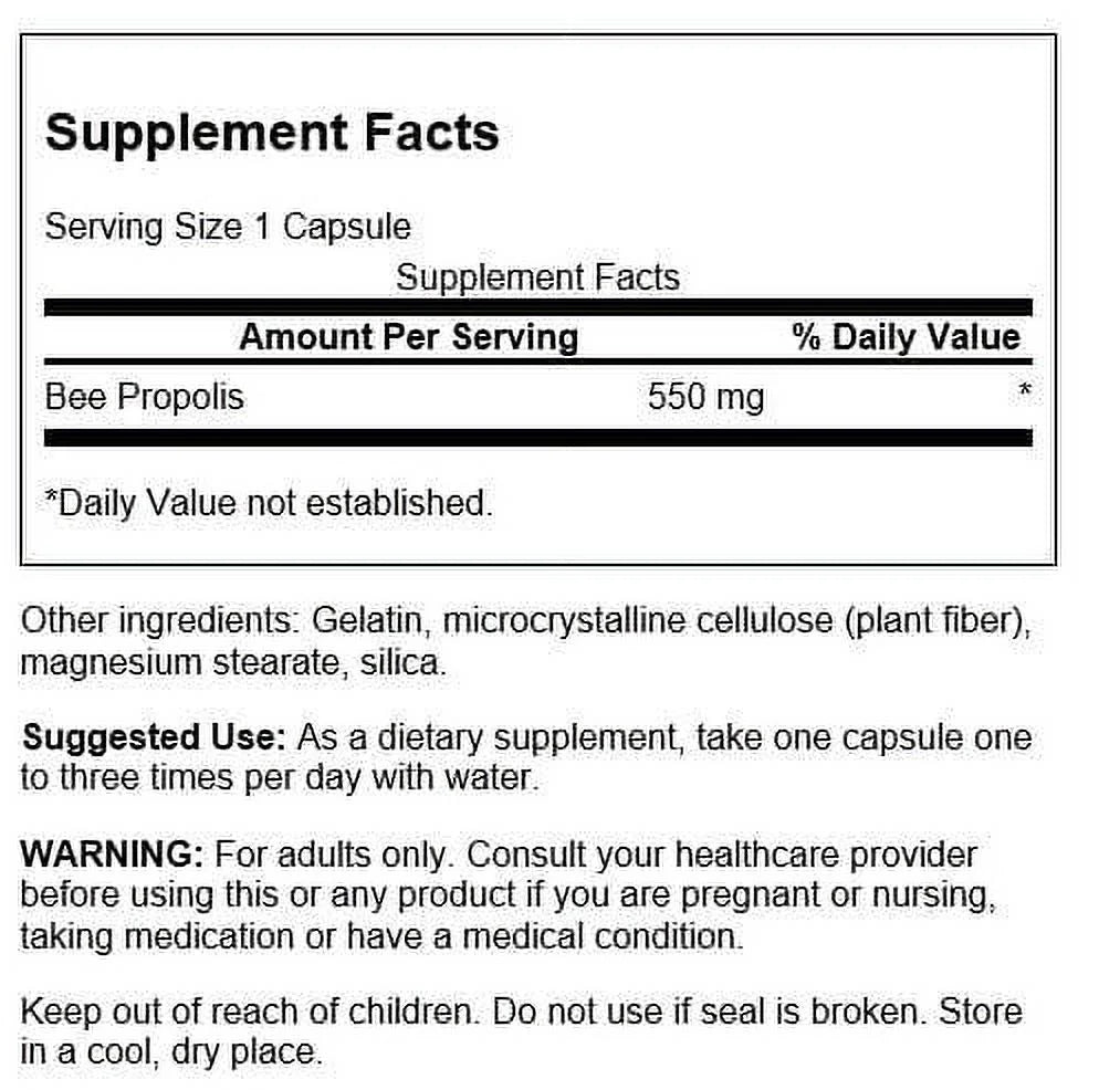 Answer: Long valued for its protective properties, bee propolis (also known as "bee glue") helps reinforce the immune system. Swanson Bee Propolis capsules are a great way to fortify your body's defenses every day. A substance that bees create from the buds and bark of trees, sometimes referred to as "bee glue," and valued for its protective properties Helps reinforce the immune system and supports respiratory health Non; Other ingredients : Gelatin, microcrystalline cellulose (plant fiber), magnesium stearate, silica. Suggested Use: Â As a dietary supplement, take one capsule one to three times per day with water. WARNING: Â For adults only. Consult your healthcare provider before using this or any product if you are pregnant or nursing, taking medication or have a medical condition. Keep out of reach of children. Do not use if seal is broken. Store in a cool, dry place