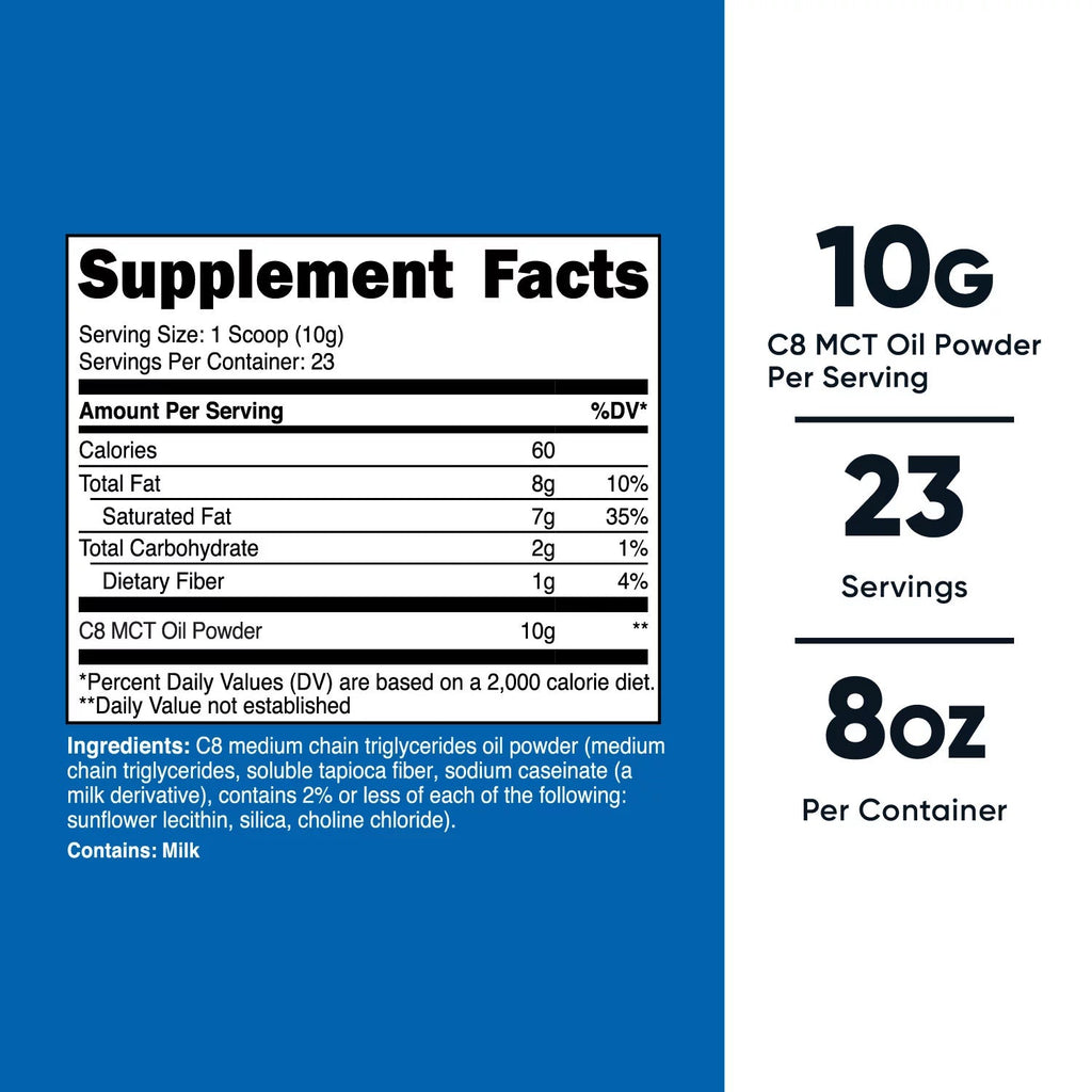 C8 medium chain triglycerides oil powder (medium chain triglycerides, soluble tapioca fiber, sodium caseinate (a milk derivative), contains 2% or less of each of the following: sunflower lecithin, silicon dioxide, choline chloride)/div>
