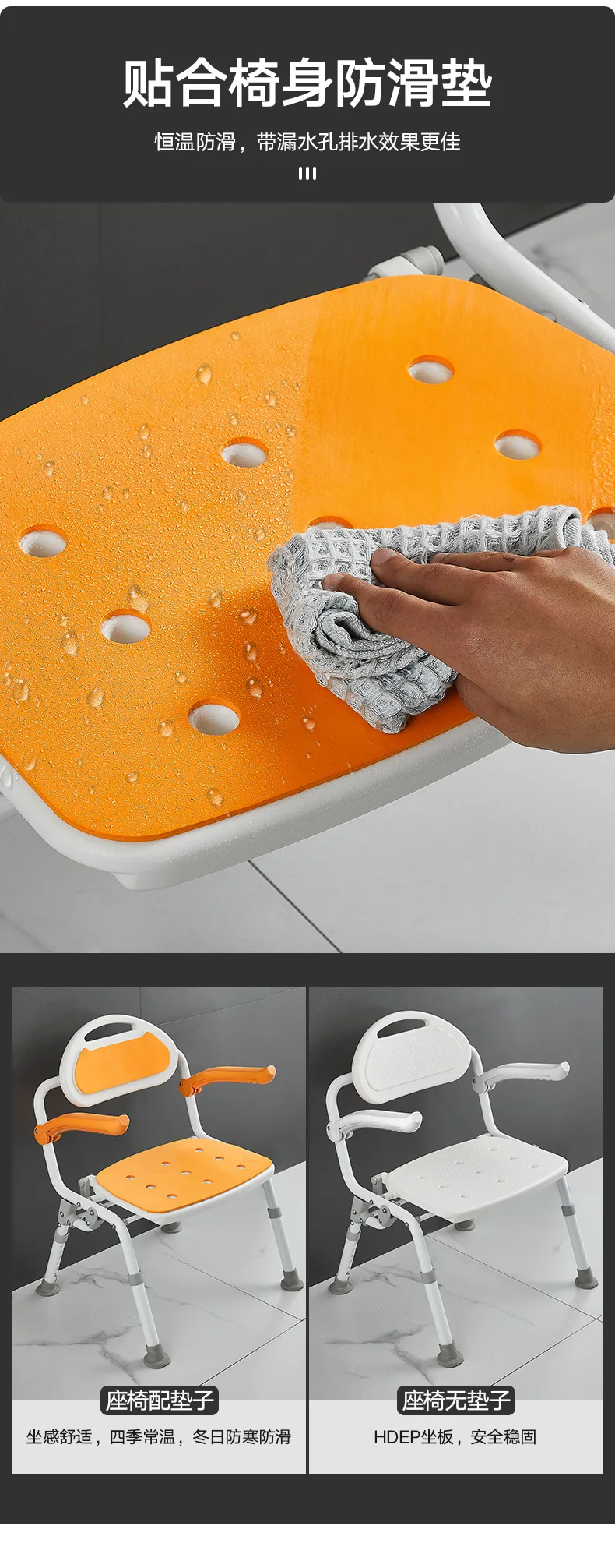 The surface of the chair is made of anti slip material, which can provide stable support even in wet and slippery bathroom environments, effectively preventing slipping and falling, making your shower time more reassuring.