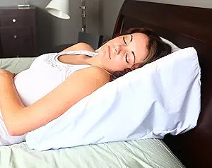 Dual Position Comfort Wedge Uniquely designed pillow supports and cradles back neck shoulders and head. Used horizontally as a bed wedge for sleeping it gently elevates the head for easier breathing. Used in the upright position vertically it provides comfort and support for sitting. Polyurethane foam with removable washable polycotton cover. White.