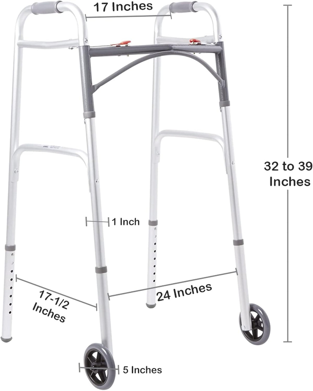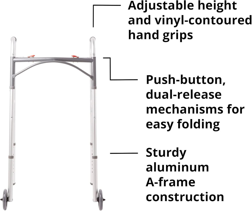This walker easily adjusts between 32 and 39 inches to accommodate users of different heights, making it a great choice for care facilities where patients share accessibility equipment. Push-button, dual-release mechanisms allow users to easily fold the walker using their fingers, palms, or side of hand to accommodate different abilities. The vinyl-contoured hand grips are set 17 inches apart for ideal comfort and stability.