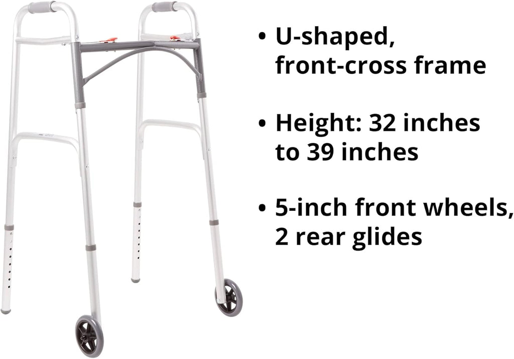 • 5-inch front wheels and improved rear glide caps allow for walker to slide easily and smoothly over most surfaces.