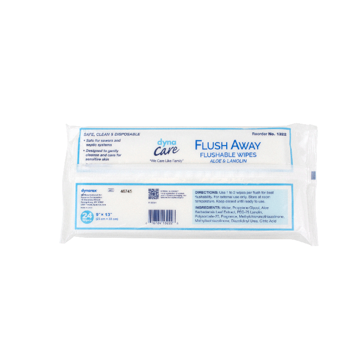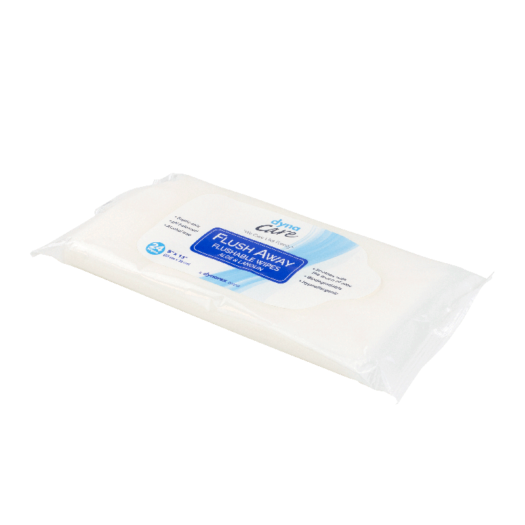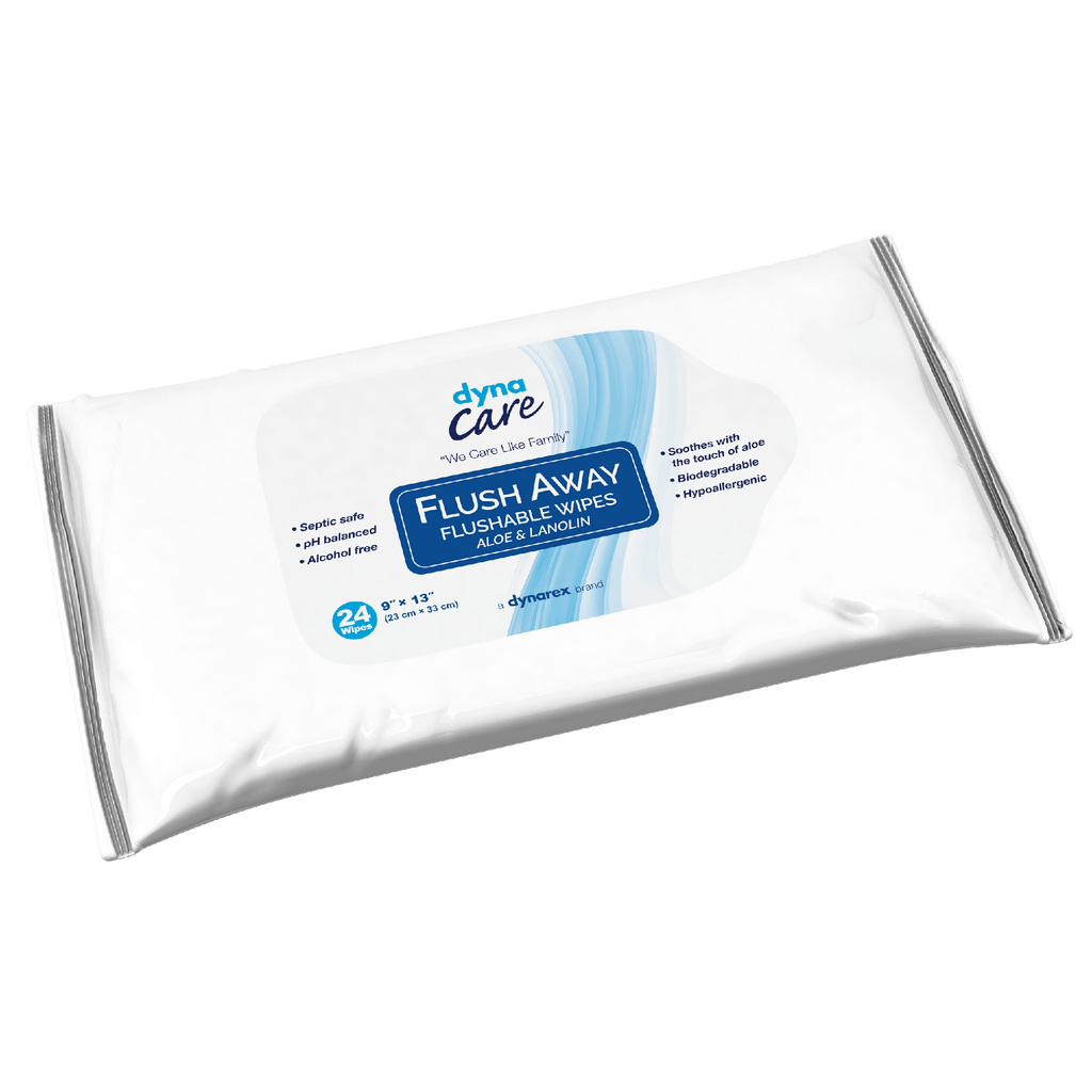 Dynarex Flushable Wipes are premium-quality, pre-moistened cleansing cloths designed to gently clean and freshen skin without the need for rinsing. Crafted from soft, spunlace materials, these alcohol-free Wipes are formulated with aloe to help soothe and moisturize skin. These convenient, disposable Wipes are crafted from biodegradable materials that break down easily after flushing for safe use with sewers and septic systems. Â