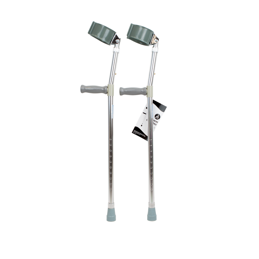 Dynarex Forearm Crutches reduce the fatigue and pain common with standard crutches and provide the stability necessary for independent mobility. Ideal for long-term use. The crutches are made from lightweight, anodized aluminum and feature independently adjustable leg and forearm sections for a customized fit. The Forearm Crutches have ergonomic contoured hand grips designed to fit users’ hands, while reducing hand and wrist fatigue. Crutches also feature molded arm cuffs help stabilize the user, reduce strain on the wrists and body. Durable construction supports users up to 300 lb. Ideal for various settings; such as homecare settings, rehabilitation facilities, and hospitals.