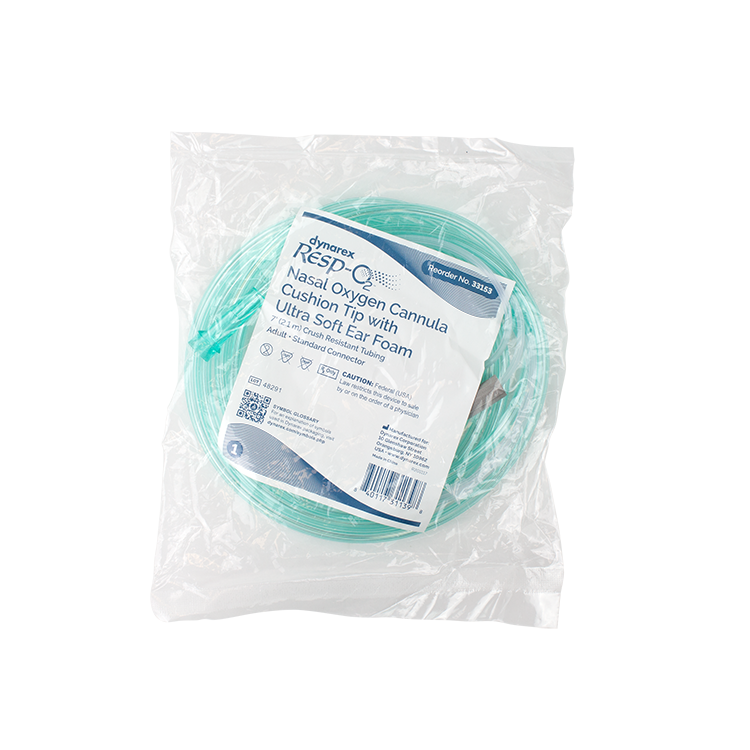 Dynarex Resp-O2 Nasal Oxygen Cannulas with Cushion Tips and Ultra Soft Ear Foam are designed to efficiently deliver supplemental oxygen to respiratory patients. The cannulas come with either Standard or Universal connectors and feature light green oxygen supply tubing, designed to help improve tube visibility.