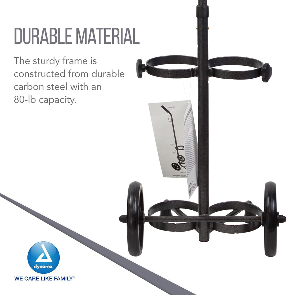 Dynarex Resp-O2™ Oxygen Tank Carts are designed to safely and reliably carry and support D- and E-sized oxygen cylinders. The sturdy frame is constructed from durable carbon steel with an 80-lb capacity. The cylinder cart is available in single-tank and dual-tank varieties and features a height-adjustable handle for easy customization.