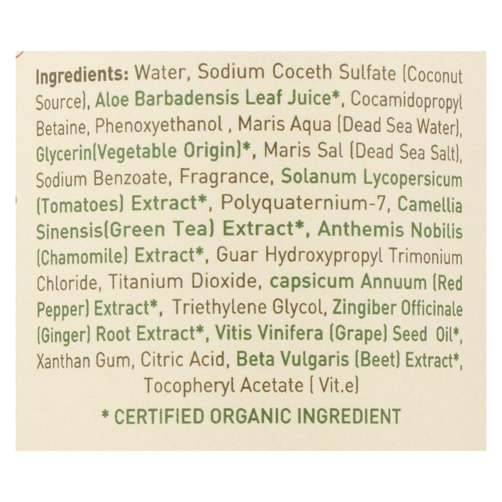 ingredients : water;sodium coceth sulfate;coconut source;aloe barbadensis leaf juice;cocamidopropyl betaine;phenoxyethanol;maris aqua;dead sea water;glycerin;vegetable origin;maris sal;dead sea salt;sodium benzoate;fragrance;solanum lycopersicum;tomatoes;extract;polyquaternium-7;camellia sinensis;green tea;anthemis nobilis;chamomile;guar hydroxypropyl trimonium chloride;titanium dioxide;capsicum annuum;red pepper;triethylene glycol;zingiber officinale;ginger;root extract;vitis vinifera;grape;seed oil;xanthan