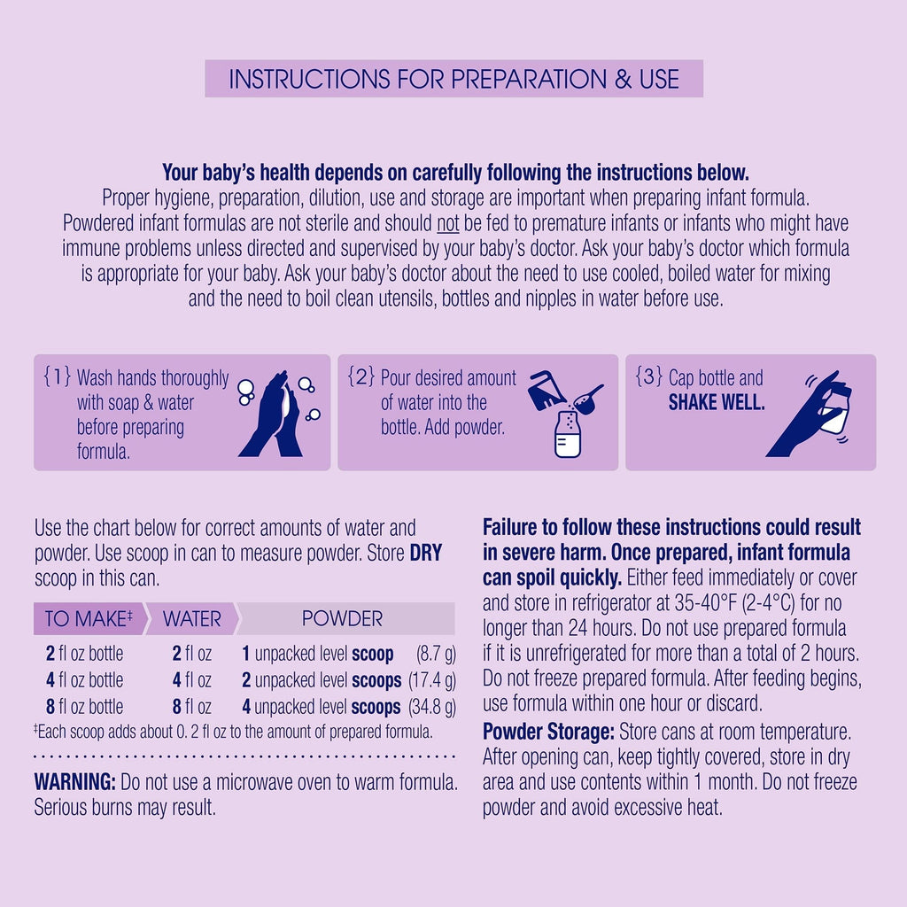 Corn syrup solids, partially hydrolyzed nonfat milk and whey protein concentrate solids (soy), vegetable oil (palm olein, soy, coconut and high oleic sunflower oils) and less than 2%: Mortierella alpina oil,* Schizochytrium sp. oil,† vitamin A palmitate, vitamin D3, vitamin E acetate, vitamin K1, thiamin hydrochloride, riboflavin, vitamin B6 hydrochloride, vitamin B12, niacinamide, folic acid, calcium pantothenate, biotin, ascorbic acid, choline chloride, inositol, calcium carbonate, calcium phosphate, magnesium phosphate, ferrous sulfate, zinc sulfate, manganese sulfate, cupric sulfate, sodium selenite, sodium citrate, potassium chloride, potassium iodide, taurine, L-carnitine